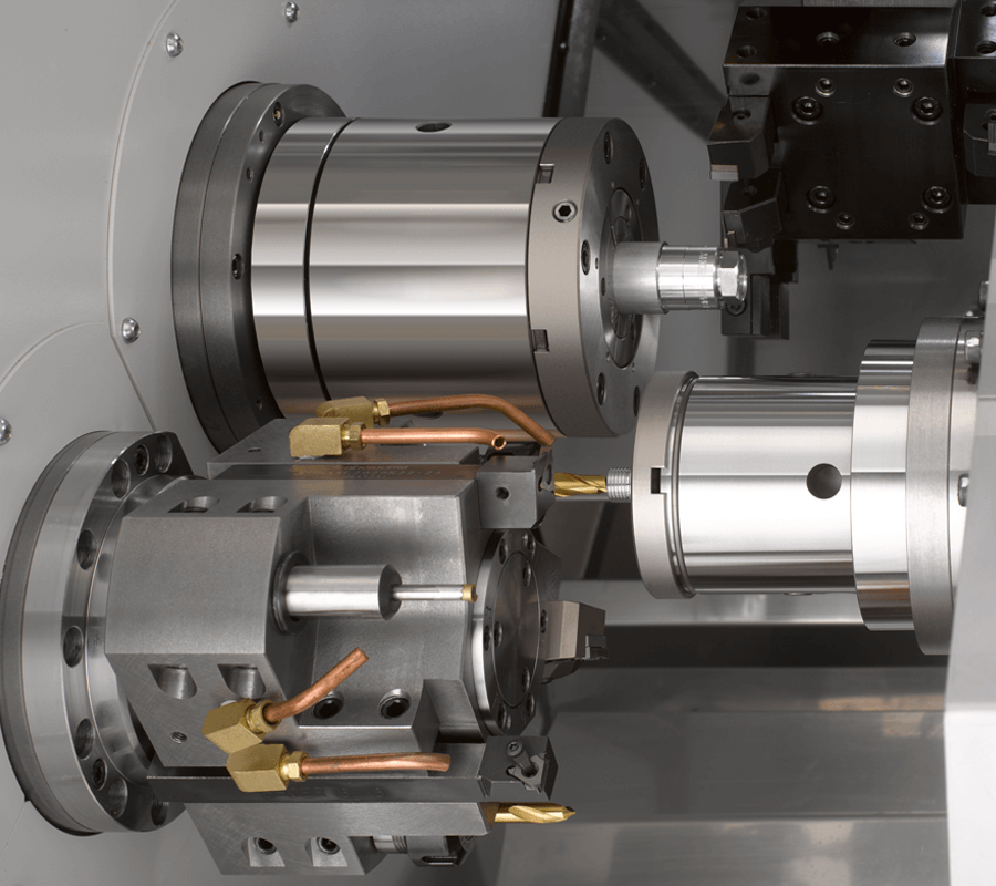 利用主刀(dao)塔和小型(xing)副主軸的(de)左右同步(bu)加工以及(ji)雙車削刀(dao)座進行重(zhong)疊加工,大(da)幅縮短加(jia)工時間