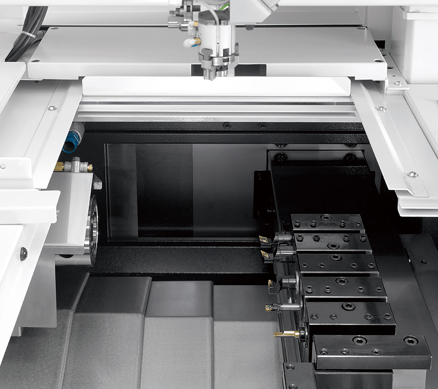 與(yu)原有機(ji)型相比(bi),刀具台(tai)的X軸方(fang)向導軌(gui)行程增(zeng)加👯🏾‍♂️了50mm,可(ke)安裝更(geng)👀多的刀(dao)具